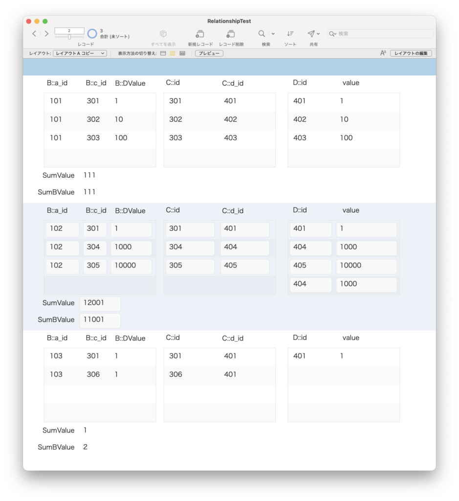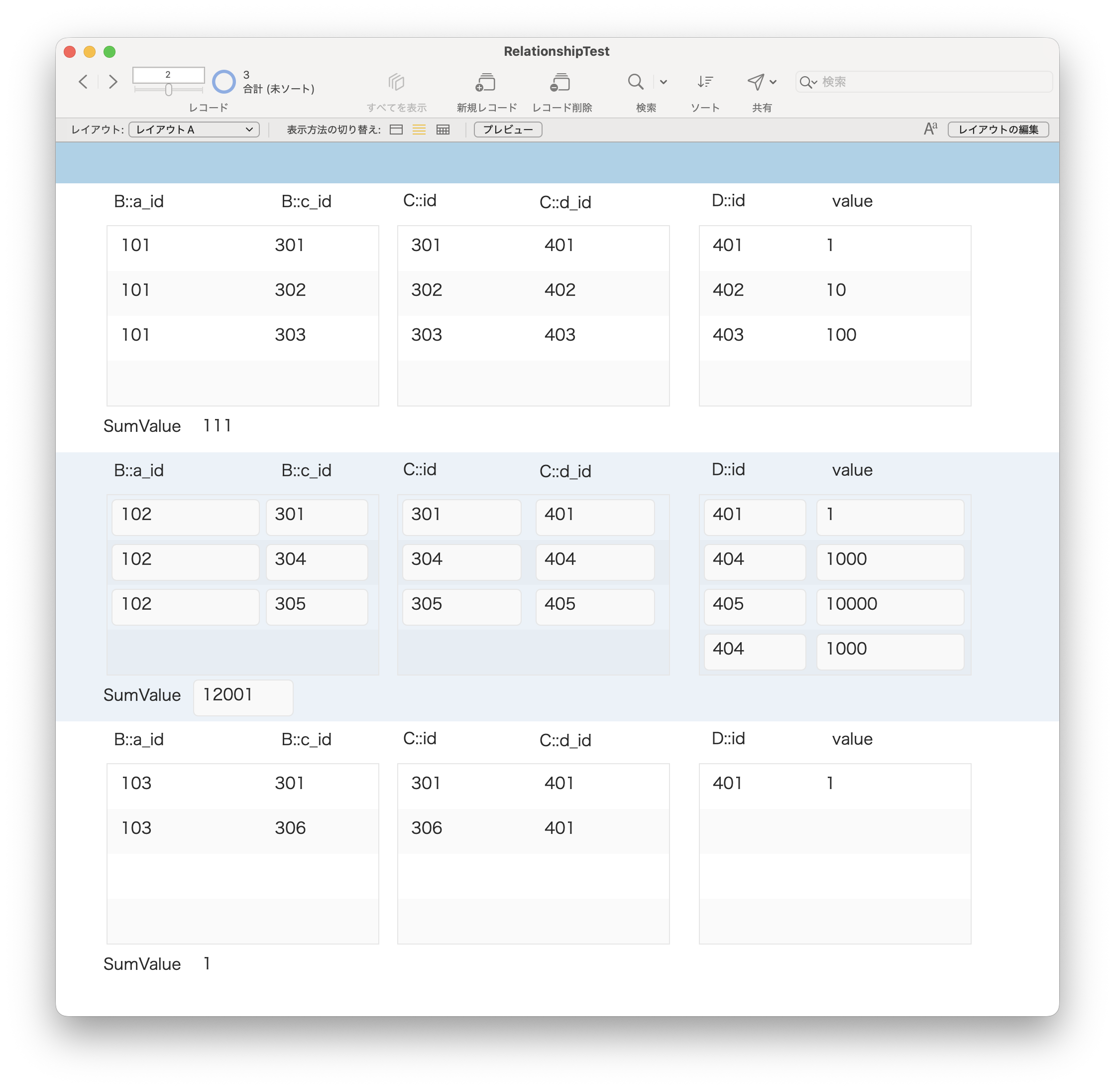a_id=101つまり、最初のレコードは、SumValueフィールドの値は111です。右端のDテーブルのポータル展開した結果を見ても、思った通りに計算できているようです。