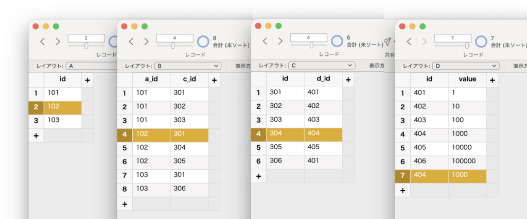 FileMakerで4つのテーブルのTOがあって、それぞれ次の図のようなリレーションシップになっているとします。というか、具体的に書いてもいいのですが、汎用的に記述しようとしているので、テーブルはABCDの4つ、それぞれ主キーフィールドが必要な場合はidフィールドとし、外部キーは、a_idなどのように頭にテーブルの文字を追加したフィールドにしています。つまり、Aテーブルのidと、Bテーブルのa_idが結合時に参照されるフィールドになるということです。Bテーブルはidはなくてもいいので、省略しています。そして、データを実際に入れてみました。